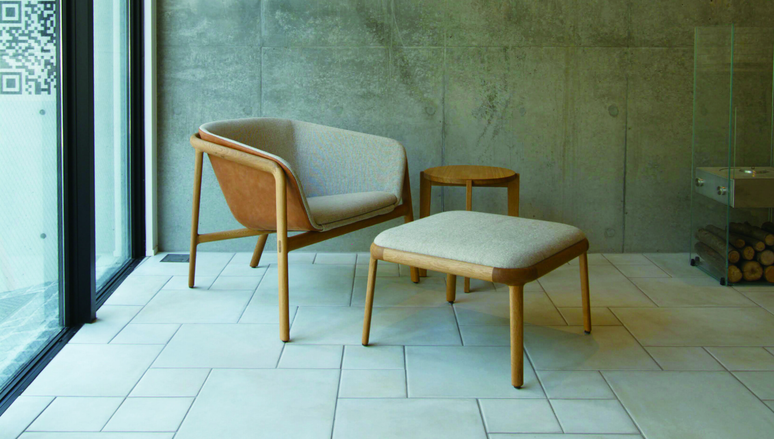宮崎椅子製作所のラウンジチェア『Golondrina(ゴロンドリーナ)』。Golondrinaとは、スペイン語で「ツバメ」という意味。その名のとおり、ツバメの翼を連想させる美しいフレームが印象的です。ミニマルで洗練された空間にこそぴったりの、特別な一脚です。ナラ材を使用し、座面と外面を異素材で張り分けました。座面は温かみあるファブリックを、外面には上質な革張りを採用。チェアに合わせたオットマンも、座面と同じファブリックで統一し、心地よい一体感が生まれました。ぜひ触れて、座って、その心地よさをご体感ください。